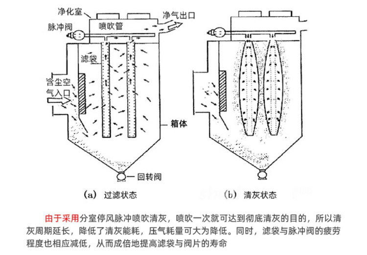 積于濾袋表面的灰塵。當一排濾袋清灰后,間隔 時間對下一排濾袋進行清灰,依次逐排進行。